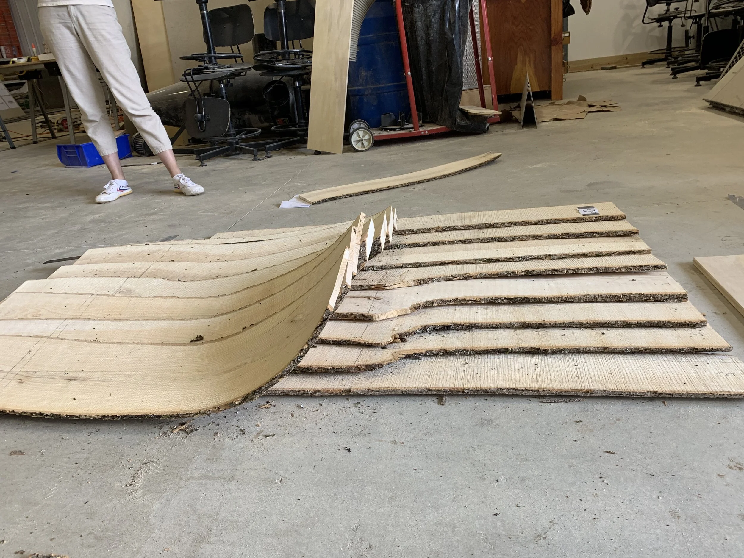 No longer bound to the paradigm of industrial standardization, this project revisits bygone wood craft and design based on organic, found and living materials. Robotic bandsaw cutting is paired with high-precision 3D scanning to slice bent logs from ash trees that are infested by the Emerald Ash Borer.