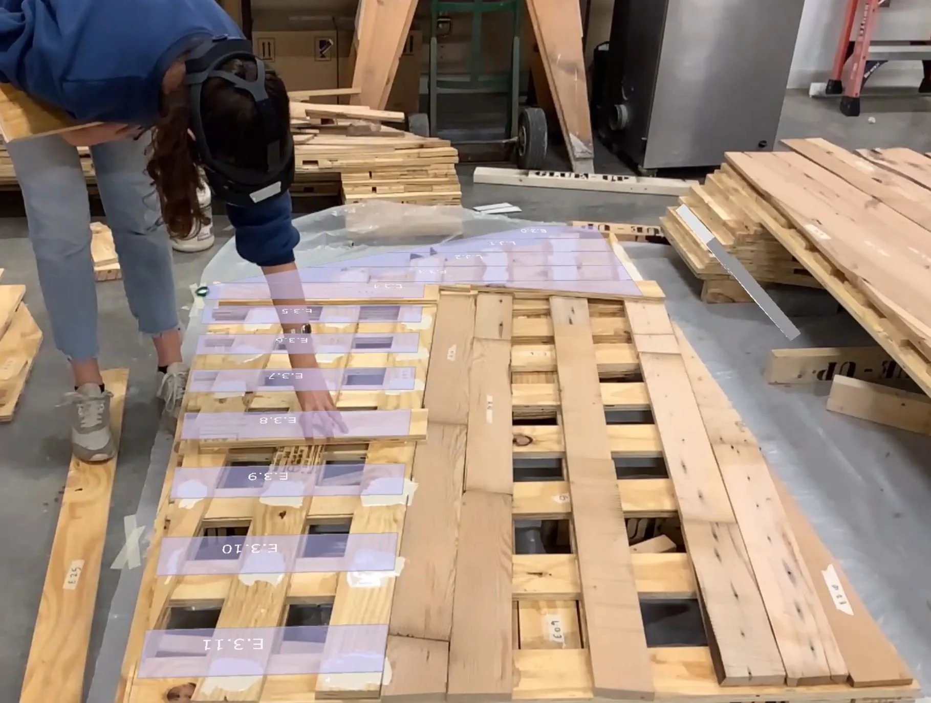 This strategy upcycles non-standardized wood boards to create a customized structural wood system by using augmented-reality (AR) construction methods. A material exploration in cross-laminated timber (CLT), the installation introduces customized hollow voids enabled by computational technologies to reduce the total material used and to develop a digitally informed and customized hollow-core cross-laminated timber (HCCLT) wall assembly. Each upcycled element can be measured, cut to scale, and assembled with holographic guides within a mixed-reality environment.